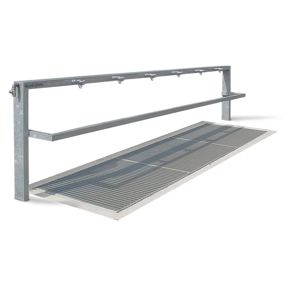 Erhältlich ist die Einbauversion in Varianten mit 4, 6 oder 8 Waschplätzen, die je nach Ausführung ein- oder doppelseitig angeordnet sind. Am Waschbügel befinden sich standardisierte 1/2"-Anschlüsse, die eine freie Wahl der Wasserhähne und Handbürsten ermöglichen (siehe Zubehör). Für sicheren Stand bei der Reinigung sorgt ein integrierter Auflagebügel aus verzinktem Stahlprofil.