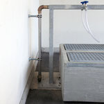 Für die Frischwasserversorgung ist ein Waschbügel aus verzinktem Stahlprofil im Lieferumfang enthalten. Je nach Ausführung verfügt dieser über 4 bis 16 Wasserhahnanschlüsse (1/2") sowie einen Schlauchanschluss mit Verschraubung (3/4", LW 16). Der Anschluss des Frischwassers erfolgt über eine eingeschweisste Muffe – links oder rechts wählbar.