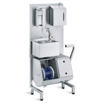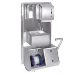 Nach der Sohlen- und Schuhreinigung wird mit dem Handgriff des Seifenspenders die optimale Menge Seife auf die Hände verteilt, und der Wasserfluss wird über einen berührungslosen Sensor aktiviert. Die Mitarbeiter können ihre Hände im Handwaschbecken gründlich waschen, wobei die Dauer des Wasserflusses nach Wunsch eingestellt werden kann. Für die Trocknung der Hände ist der Hygienecenter mit einem Papierhandtuchspender ausgestattet, der Einweg-Handtücher für die Entsorgung im 40-Liter-Drahtgeflecht-Papierkorb bereitstellt.