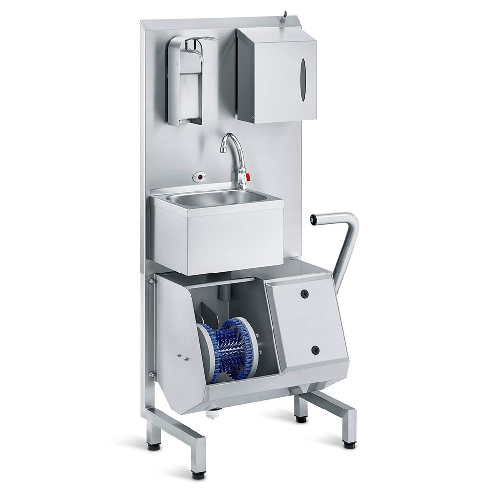 kleinstem Raum befinden sich ein automatisches Waschbecken mit Seifenspender, ein Falthandtuchspender mit Papierkorb sowie ein professionelles Sohlenreinigungsgerät. Unser ausgeklügeltes Design