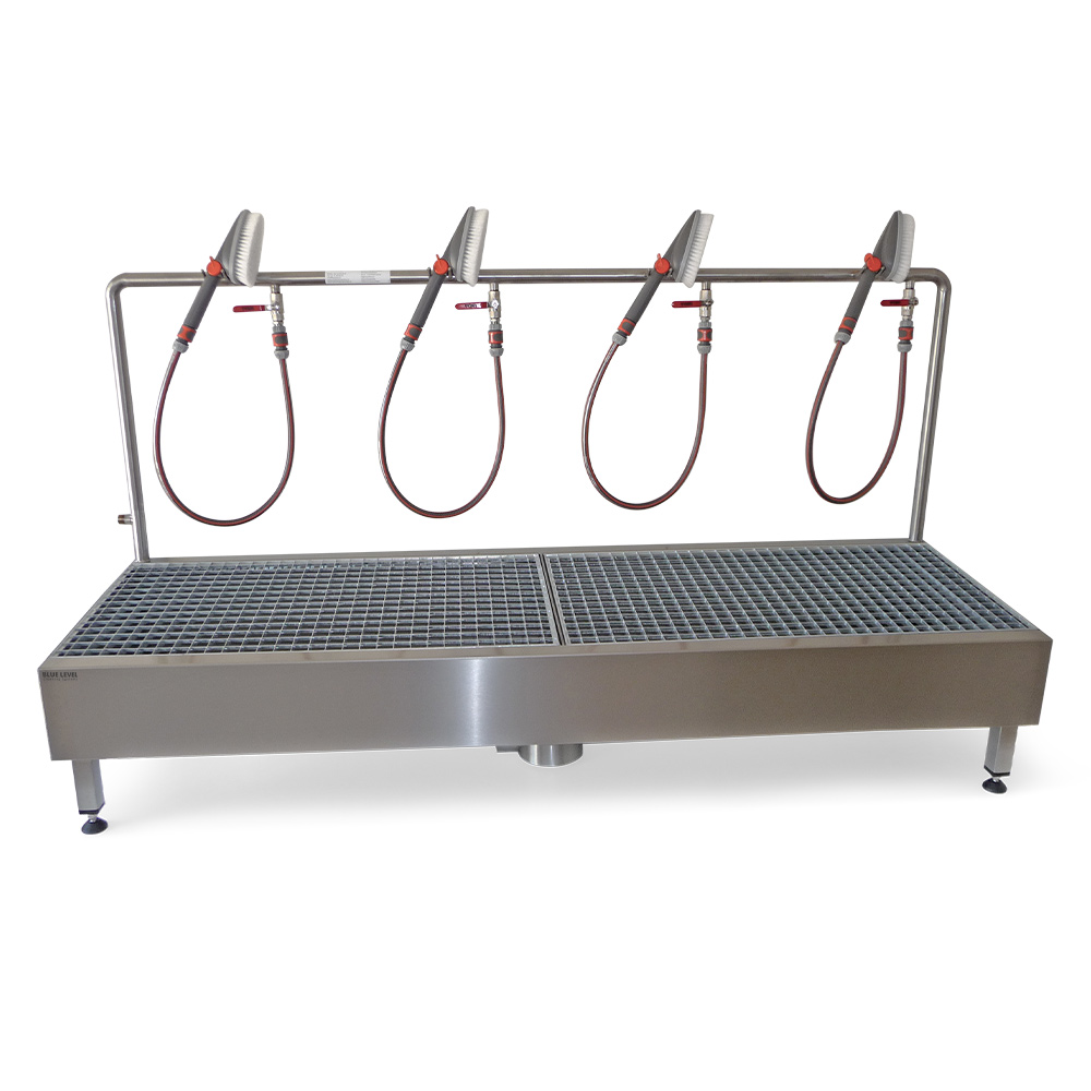 Beim Stiefelwaschplatz mit Handwaschbürsten handelt es sich um eine professionelle Schuh- und Stiefelwaschanlage für den intensiven Einsatz in der Landwirtschaft, Metzgereien oder Feuerwehr-